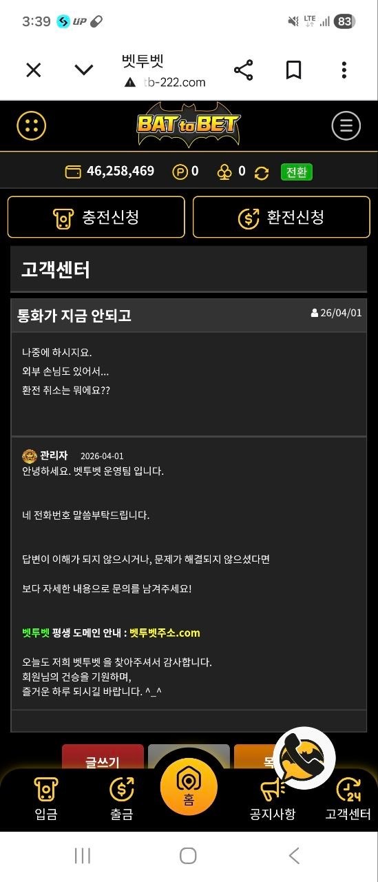 벳투벳 환전 진행 문의하다가 계정 이용 제한까지 된 내용 남깁니다 작성자 정보 다야다야쪽지보내기 메일보내기 자기소개 아이디로 검색 전체게시물쪽지보내기 메일보내기 자기소개 아이디로 검색 전체게시물 작성 작성일 2026.04.09 20:37 컨텐츠 정보 15 조회 목록 답글 쓰기 본문 사이트 이름 벳투벳 사이트 주소 btb-222.com 피해날짜 2026년4월1일 피해금액 4625만원 피해 내용 벳투벳 4625만원 환전을 신청한 뒤 안내에 따라 계속 대기하고 있었습니다. 중간에 별다른 해결 안내는 없었고, 기다리는 시간만 길어졌습니다. 결과적으로 환전은 정상적으로 처리되지 않았고, 이후에는 계정 이용도 어려운 상태가 됐습니다. 혹시 비슷한 흐름을 겪은 분들이 있는지 참고해보고 싶어서 이렇게 글 남깁니다. 이용 중인 분들은 환전 신청 내역이나 안내 받은 내용부터 미리 정리해두시는 게 좋을 것 같습니다. 관련자료 댓글 0 등록된 댓글이 없습니다. Select File Upload File 목록 답글 쓰기